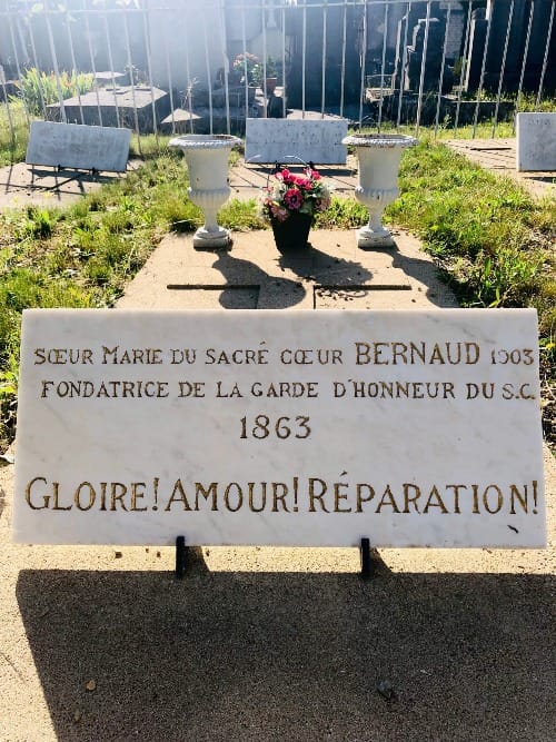 Nagle w cmentarną aleję wjeżdża niski, ciemny samochód. Odsuwamy się instynktownie, ale auto staje, a w otwartej szybie widzimy uśmiechniętego od ucha do ucha naszego przewodnika po cmentarzu. „Je m'ai trouvé!” – woła. Czyli: „Znalazłem ją!” Wsiadamy, a on w euforii pędzi w odległą strefę cmentarza. Wreszcie hamuje, niemal w miejscu, i biegnie do podobnej jak wcześniej, ogrodzonej płotkiem parceli. Uśmiechnięty wskazuje płytę z imieniem siostry. Złote litery błyszczą w słońcu. Auto rusza, my nie ruszamy, machamy do siebie, bez słów. Na niewielkim kawałku białego kamienia odczytujemy imię i nazwisko siostry Marii Konstancji Bernaud, która w 1863 r. założyła Honorową Straż Najświętszego Serca Pana Jezusa.